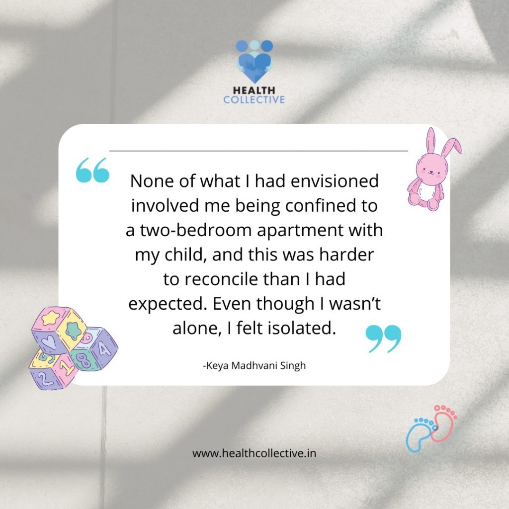 One evening, when the baby was about two months old, my husband was running late from work. The hospital he worked with had put him in charge of managing a COVID-19 center. He did his best to return between 7 and 7:30 pm, but this day it was 8:30 and he still wasn’t back. The baby was having a bad evening and was crying inconsolably. I just couldn’t figure out how to calm him down. It had been an hour and I had tried everything. I remember calling my mother in a panic, and then collapsing in an exhausted puddle of tears. That’s how my husband found me – in a miserable, hopeless, lonely heap on the floor, with our baby beside me, finally peaceful in his rocker.