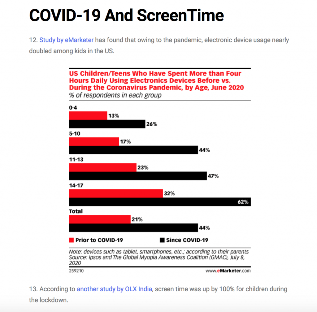 A 2020 report cites studies that show that “electronic device usage nearly doubled among kids in the US” and that “according to another study by OLX India, screen time was up by 100% for children during the lockdown.” (Read more here)