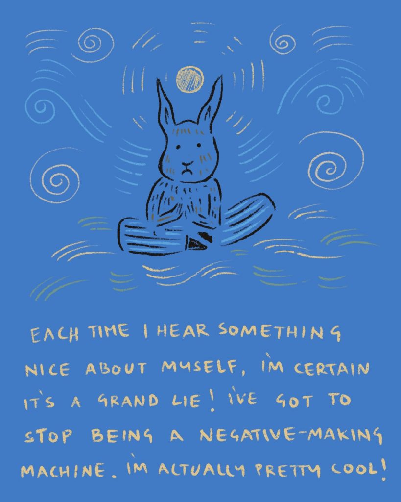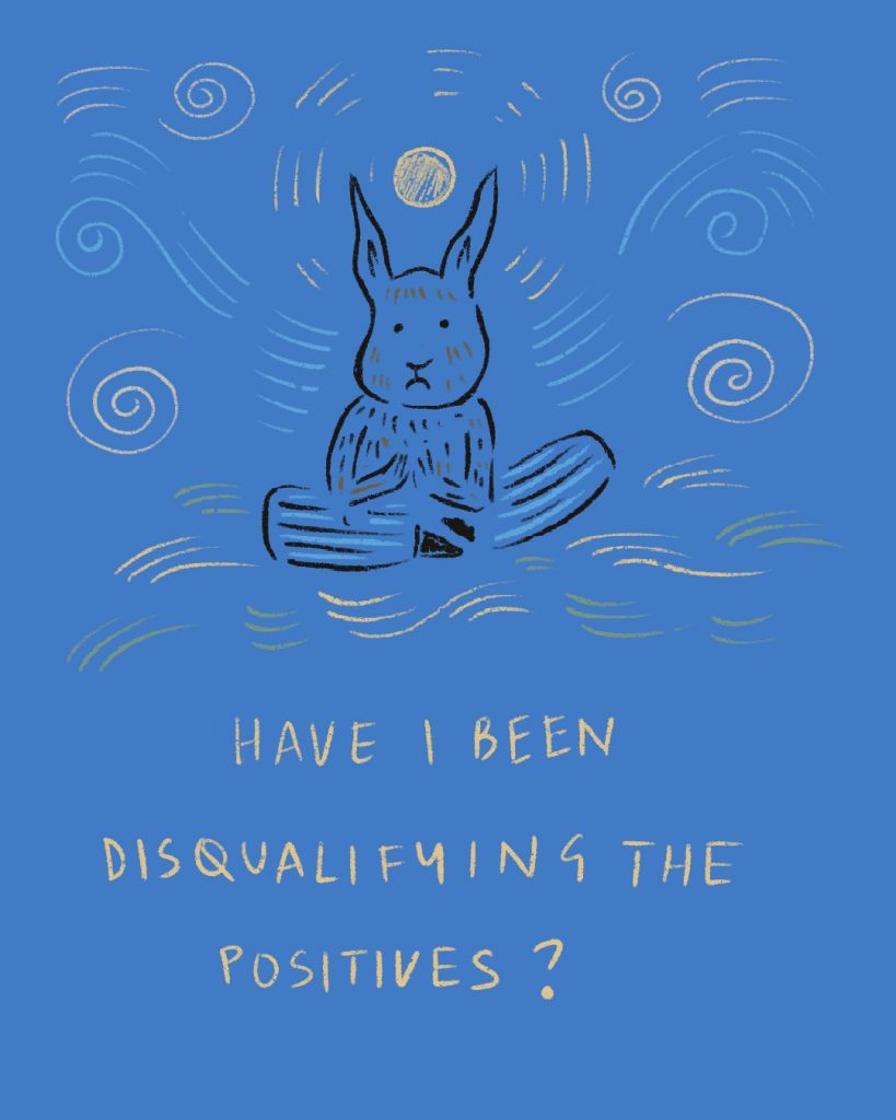Tsuki means Moon in Japanese. The moon, being Tsuki Rabbit’s namesake, always brings a flash of inspiration to Tsuki when he is drowning under the burden of a cognitive distortion. I am indebted to Dr. David Burn’s book ‘Feeling Good: The New Mood Therapy’ for illuminating some of the many cognitive distortions that may afflict us from time to time. My work is inspired by his definitions of the distortions.