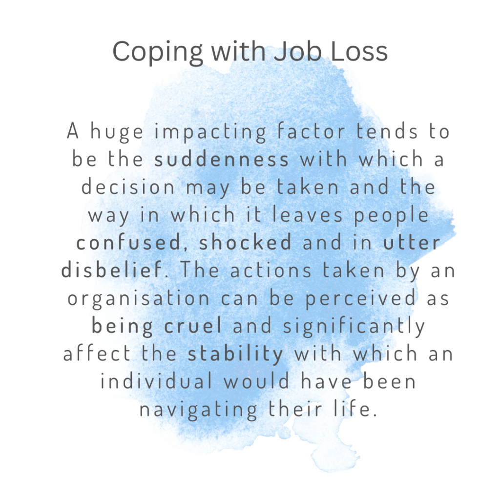 The clear financial concerns apart, it is important to understand that the impact can be due to multiple factors. For example, a huge impacting factor tends to be the suddenness with which a decision may be taken and the way in which it leaves the person/people feeling confused, shocked and in utter disbelief. The actions taken by an organisation can be perceived as being cruel and they significantly affect the stability with which an individual would have been navigating their life. The fact that not everyone is let go of and that others may continue to work in similar positions leads to questioning of the self and can raise conjectures about what was wrong and why it was that a particular person or people were the ones to be let go of.
