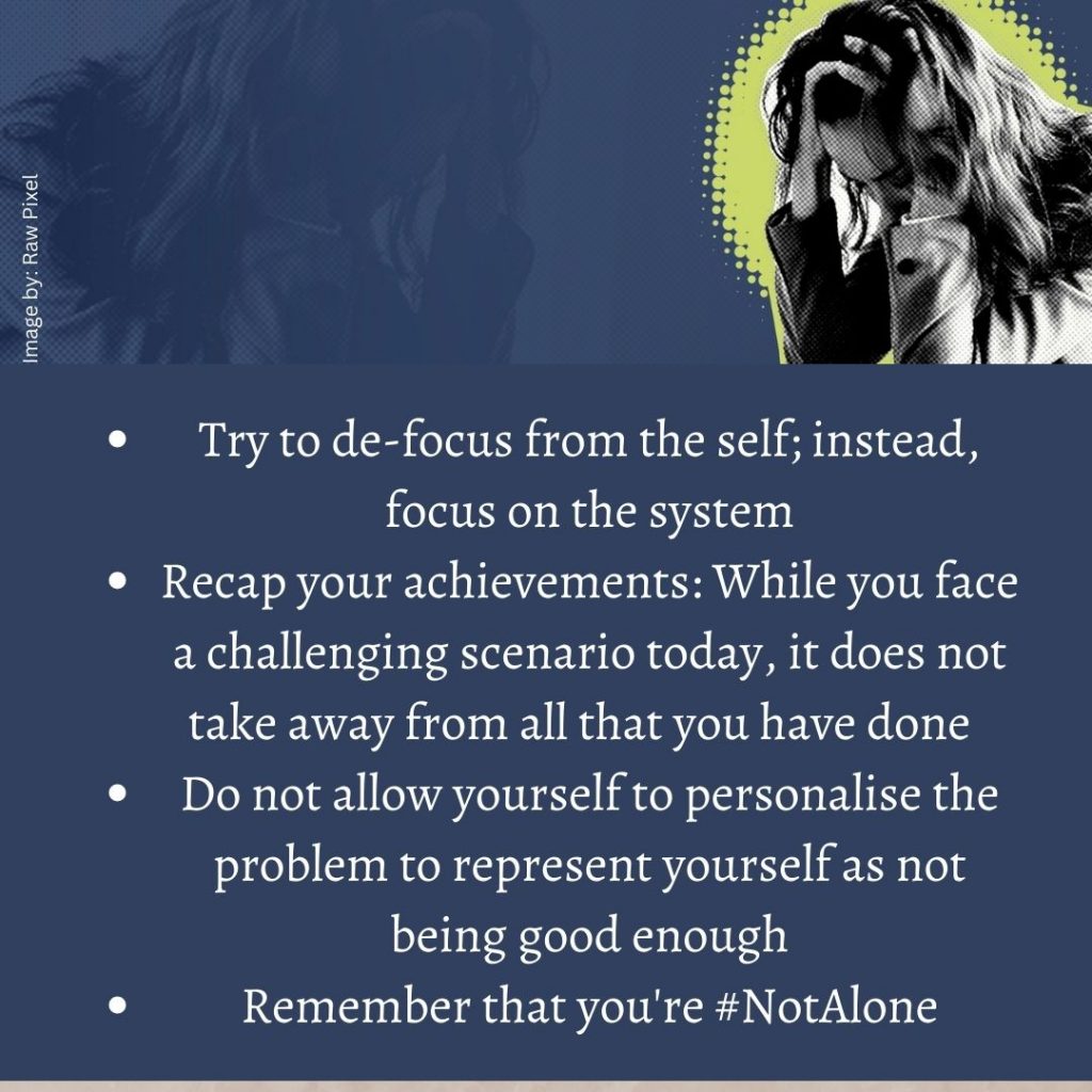- Do not allow yourself to personalise the problem to represent yourself as not being good enough. Isolate what has happened and link it to the system and you not being a good fit in current scenarios. But at the same time remember that the same you were a good fit and what is happening is on account of the transitions and macro factors.