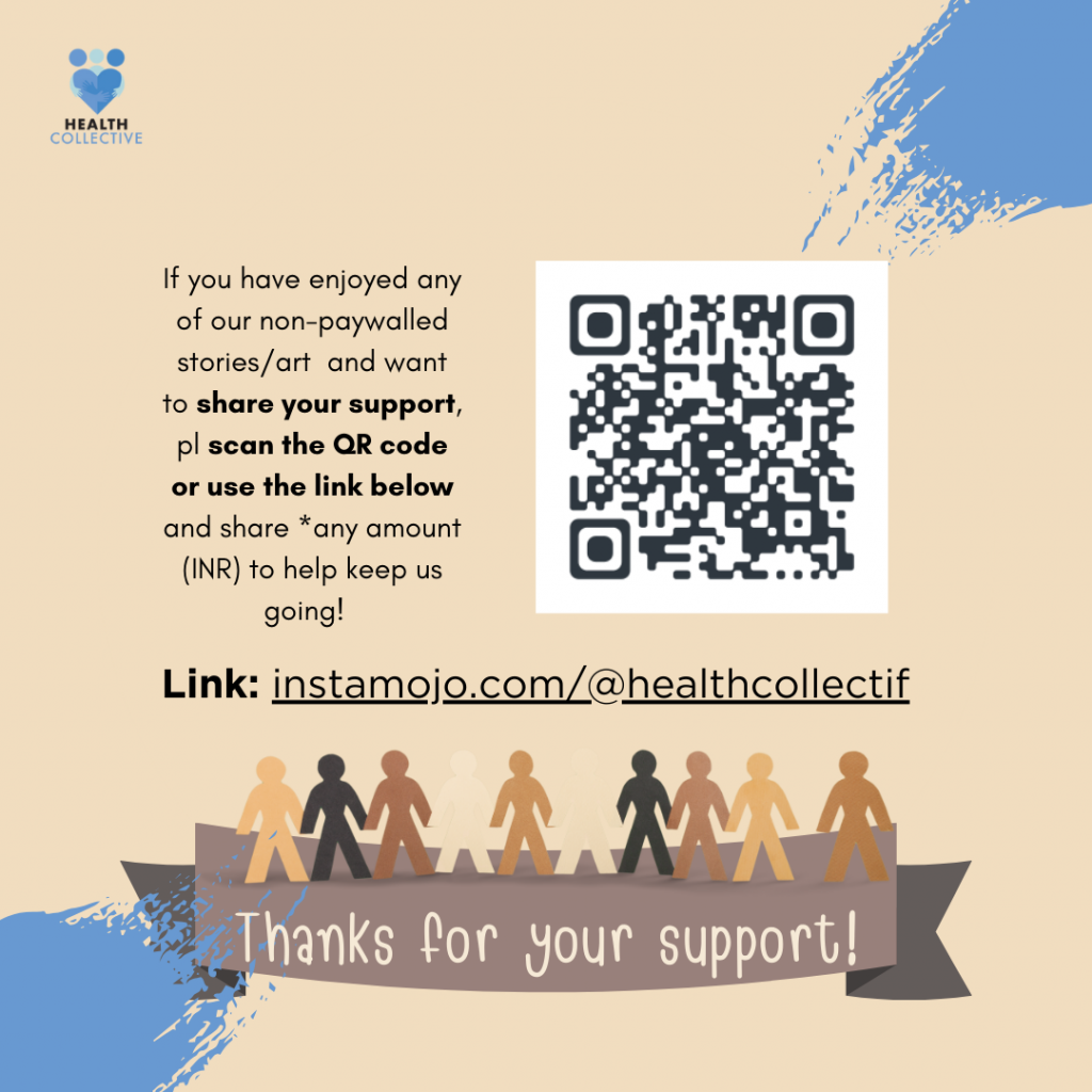 The Health Collective is not in the business of nor intends to provide counselling service. The professionals, the website of the professionals and helpline numbers listed on the The Health Collective are not employed, associated or endorsed by The Health Collective. The professionals and the organisations behind the listed websites and helpline numbers, on The Health Collective website, are independent third parties and there is no relationship of principal-agent, employer-employee, partnership of any nature with The Health Collective. The Health Collective does not make any recommendation or guarantee service or quality of any professional or helpline number or website listed herein. The Health Collective does not make any representations, warranties or guarantees as to, and is in no manner responsible for, the services provided by the professionals or their websites or the helpline services. The stories and comics set out by The Health Collective are intended purely for reference purposes. Advice or stories set out herein are by no means intended to malign or defame any person, organisation, caste or community. Advice or stories set out herein are views of the concerned author only, The Health Collective does not claim copyright or endorse or recommend or represent on veracity of the advice contained in the articles or stories (including the comics) on this website. Additionally, the articles and stories set out herein should not in any manner be considered as substitute for professional help. All experiences are personal, hence advice and suggestions contained in the articles and stories may not apply to a reader’s specific facts or situations, and it is recommended that professional help is sought for such matters. The Health Collective disclaims all liability of all nature arising out of reliance placed on the advice set out in the articles and stories or arising out of meetings with professionals or calls with the professionals or helpline numbers mentioned on the website of The Health Collective.