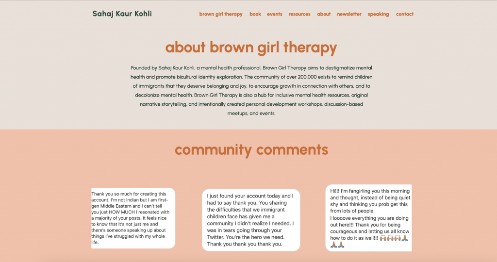 Kohli founded the ‘Brown Girl Therapy’ community in 2019, beginning with a page on Instagram (@browngirltherapy) which now has over 200,000 followers on the platform. The community is purportedly the first and largest community for children of immigrants. In the book, Kohli explains how while her initial intention was to focus on South Asian women, she soon realised that her work and experiences with her family and culture were relevant to people across the world.