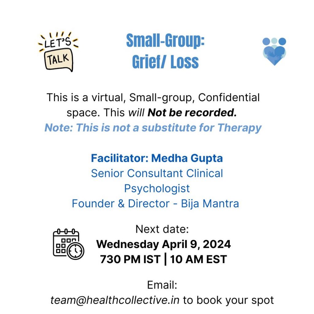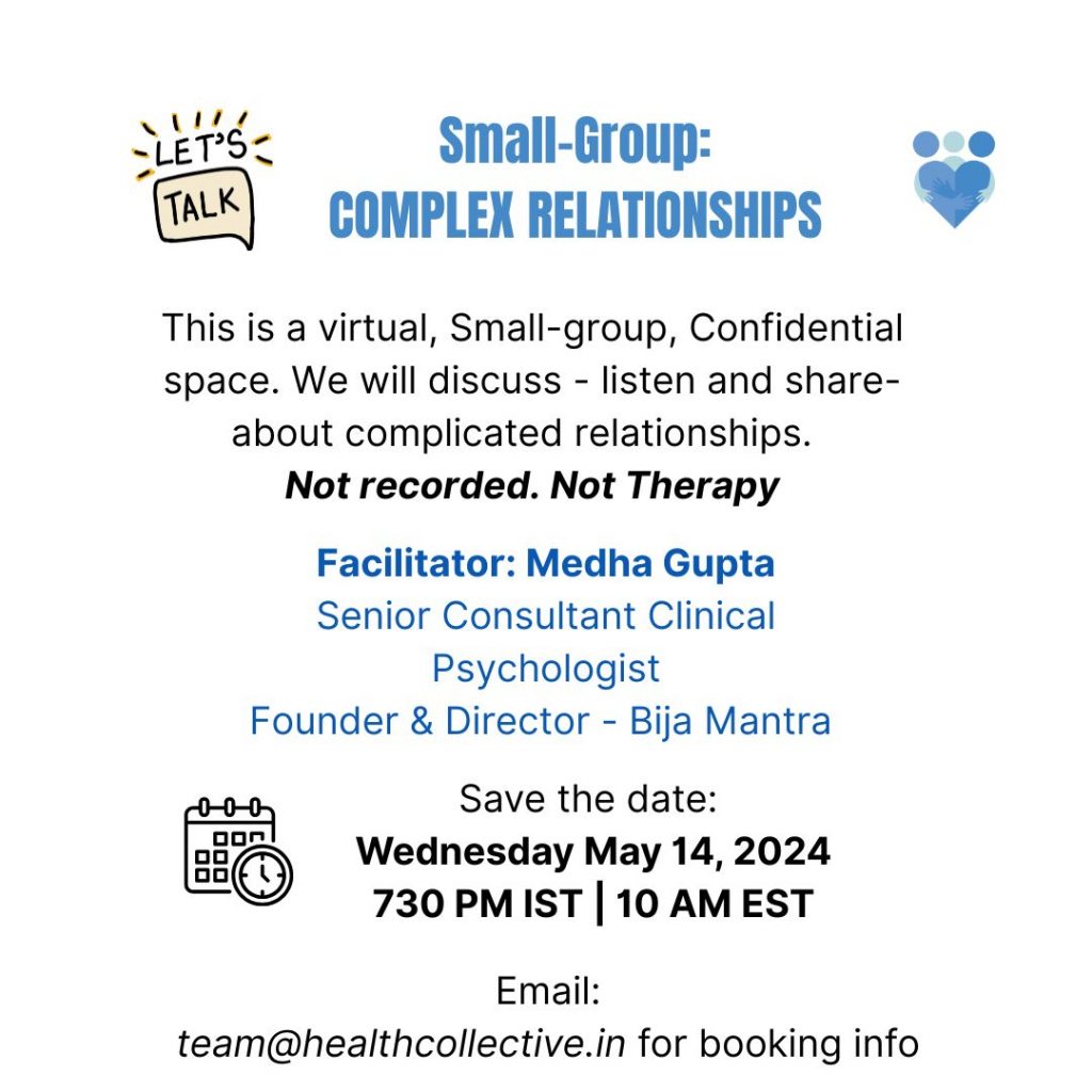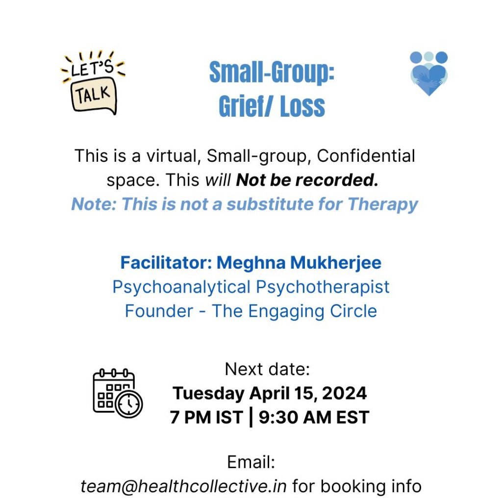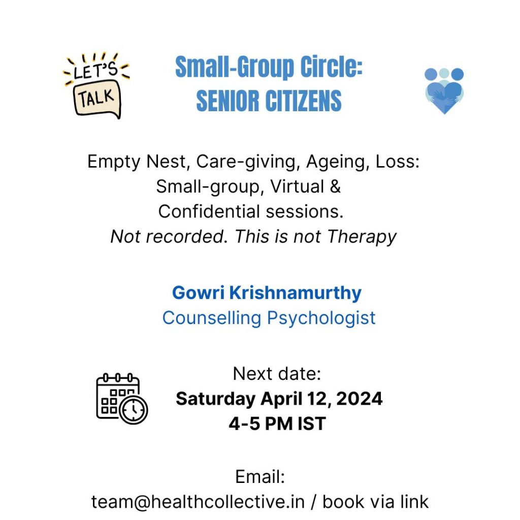We have a series of Health Collective curated, therapist-facilitated listening and talking circles upcoming. Do take a look and make a booking to reserve your spot; cancellations allowed up to 24 hours beforehand. You can email (team@healthcollective[dot]in) for the booking link.