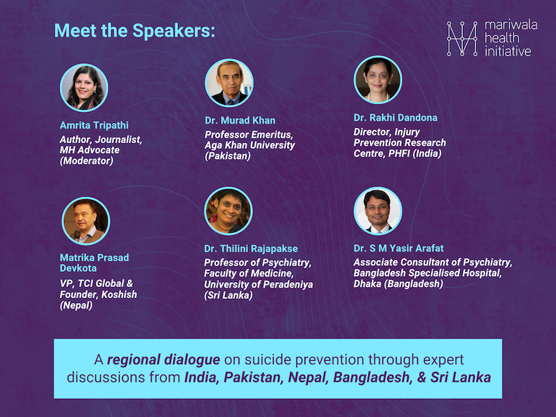 This webinar, hosted by Mariwala Health Initiative (MHI), aims to create a regional dialogue on suicide prevention by bringing together experts from India, Pakistan, Bangladesh, Sri Lanka, and Nepal.