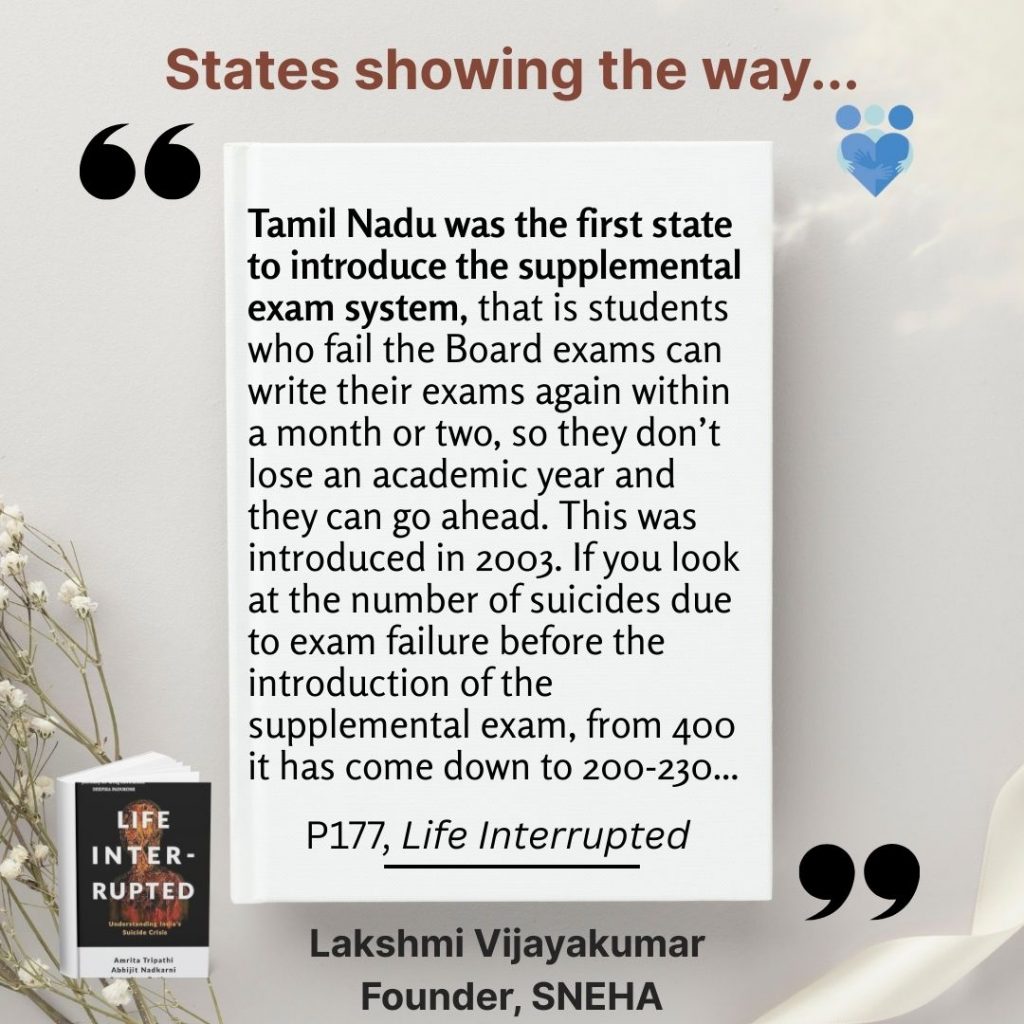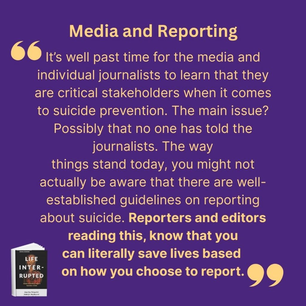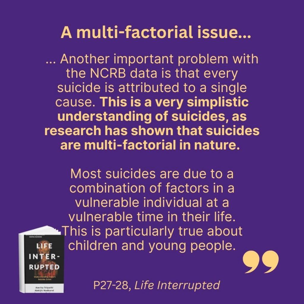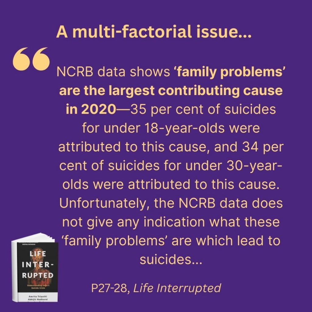 Sharing some more information here from a book we co-authored, which includes many perspectives and as little jargon as possible. Simon and Schuster India published the book Life Interrupted: Understanding India’s Suicide Crisis by Amrita Tripathi, Abhijit Nadkarni, Soumitra Pathare. An excerpt from the book’s introduction follows, published with permission.